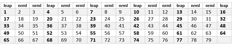 One moon year is 354.3670 days. So it requieres fraction almost equal to 0.3670 which is 29/79. Which means we must make 29 leap years in moon 79 years. We must distribuite these 29 leap years in homogenic practical way, easy to memorise and apply. We need an algorithm valid during 79 years.